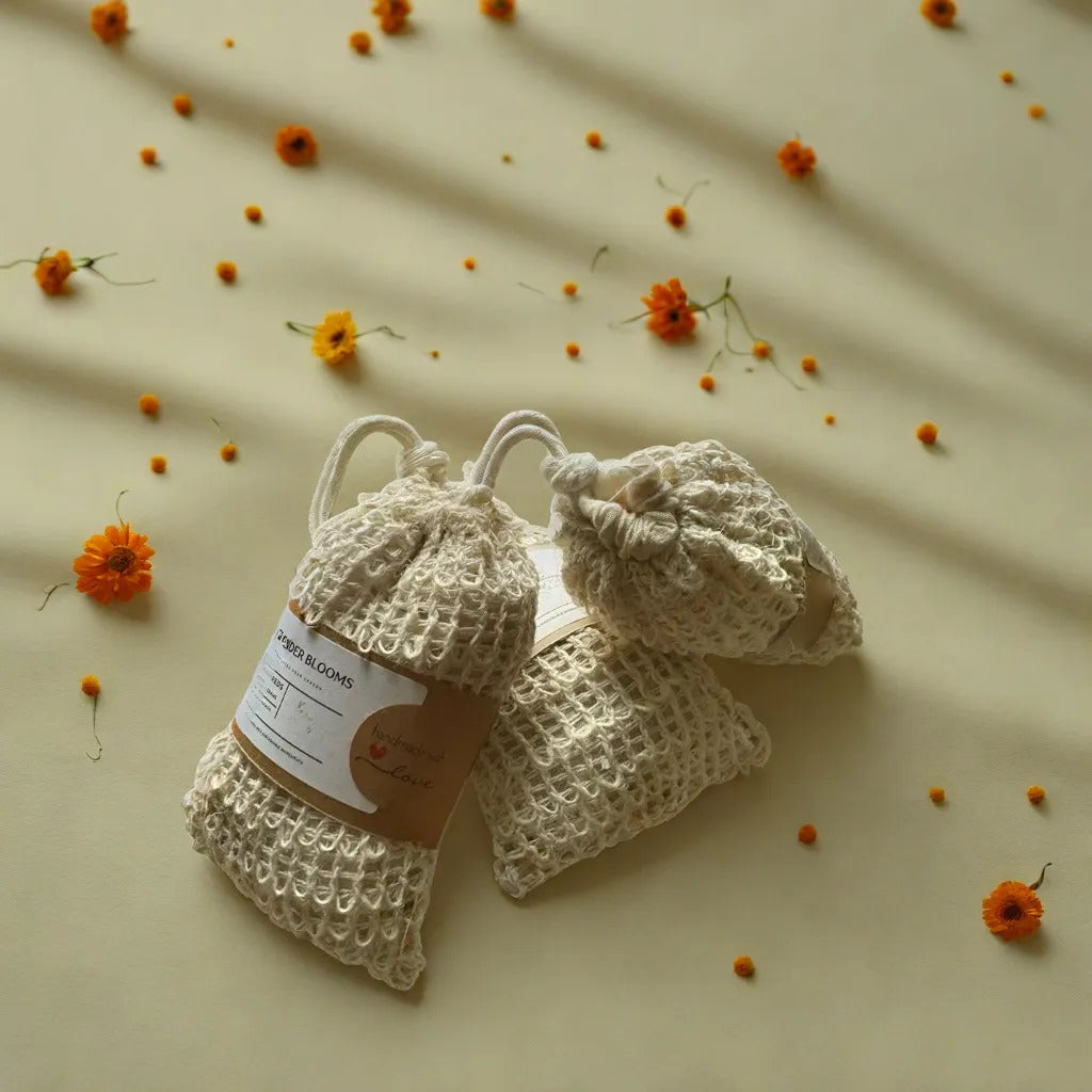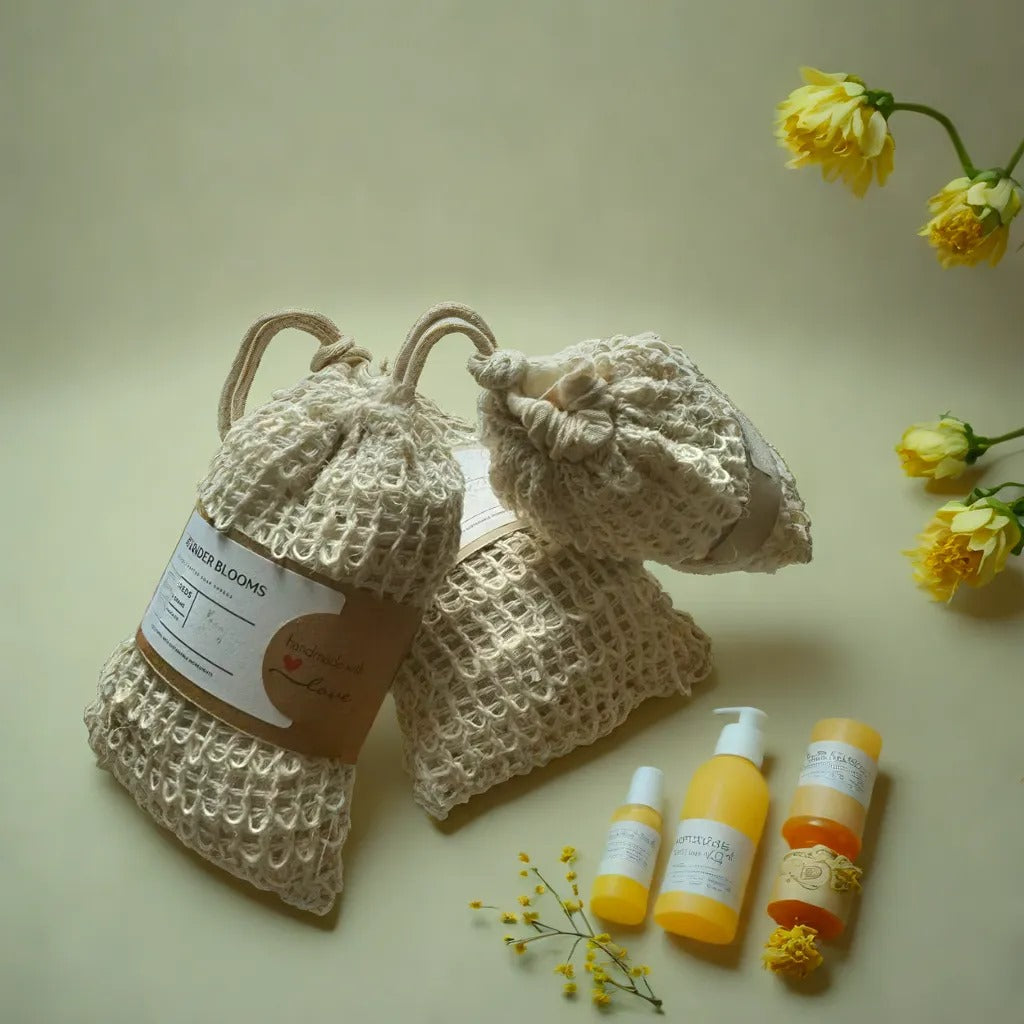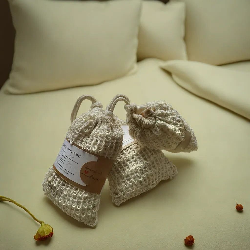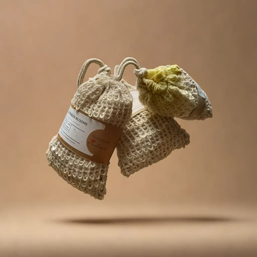Wet the sisal soap bag under warm water and rub between your hands or directly onto your skin to create a luxurious lather. After use, hang the bag to dry to prolong the life of your soap and keep it fresh.